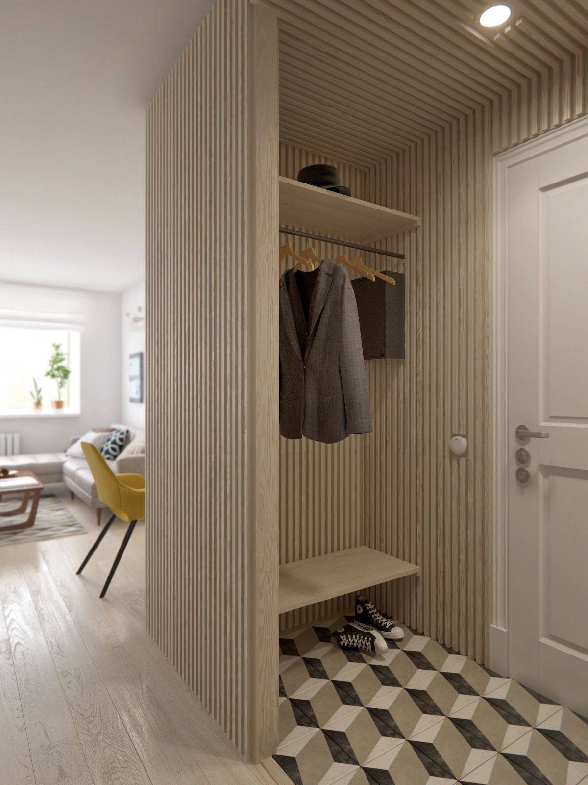 На фото квартира хрущевка с маленькой прихожей, выполненной в норвежской стилистике.