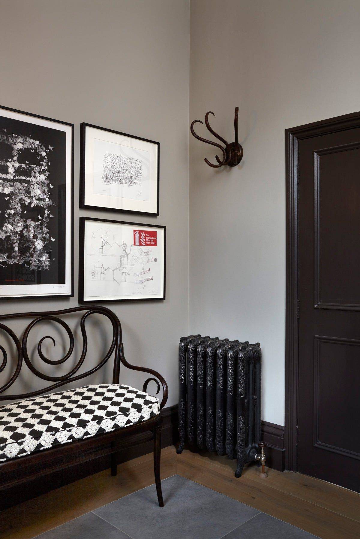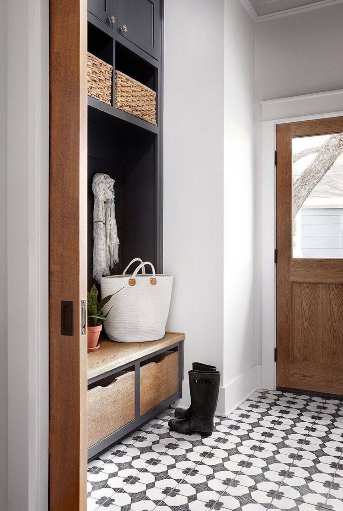 Интересно подошли к организации места для хранения верхней одежды здесь. Видите? Фасад шкафа похож на акцентную стену в прихожей.