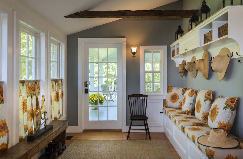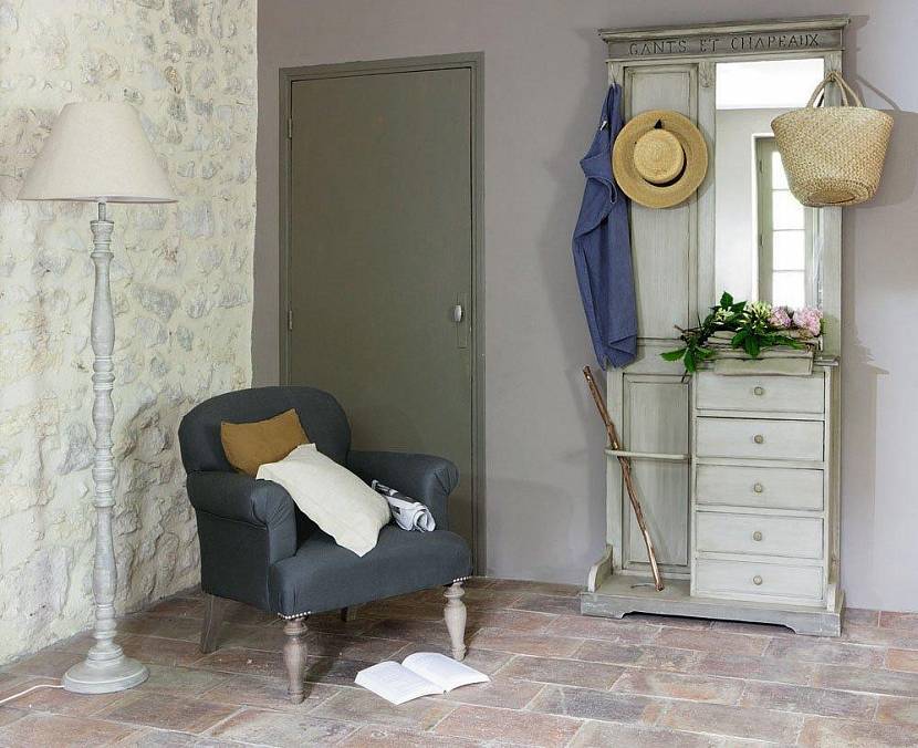 Для стен прихожей тоже нет исключения, поэтому для их отделки используют деревянны панели. Каждая такая деревянная панель должна быть светлого тона, иметь состаренную фактуру, чтобы получался винтажный эффект антуража. Верхнюю часть стен можно оформить в виде натурального камня или кирпича. Затем на стены наносится фактурная и штукатурная смесь. После чего стены оклеиваются текстильными или виниловыми обоями. На обоях может быть рисунок или принт в виде полосок или цветочков. В качестве дополнения подходят бумажные обои стандартного варианта. Кстати, поверхность можно оформлять и тканью. В целом, каждую из выше перечисленных техник можно комбинировать. Непременно получиться превосходный результат!