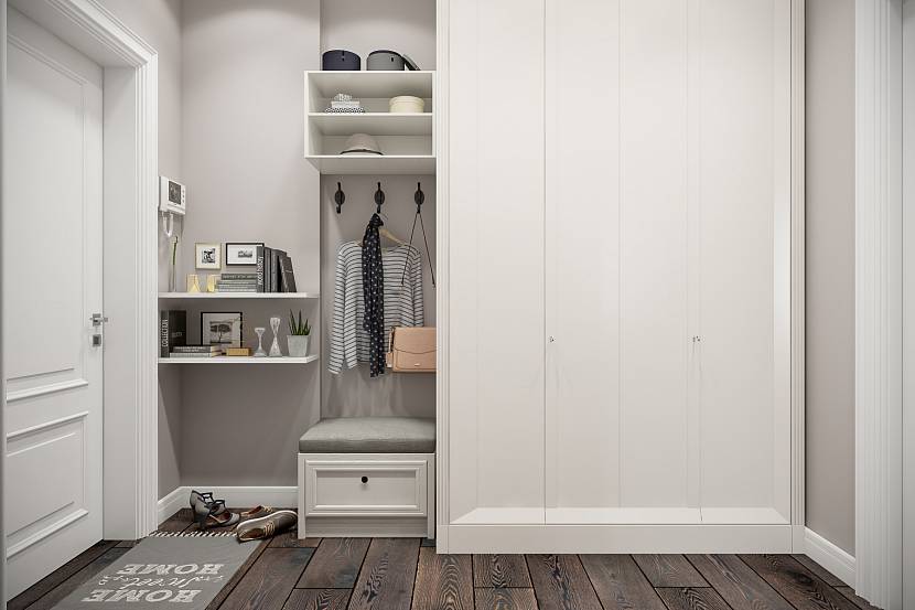 Чем меньше предметов попадет на пол, тем больше будет порядка и чистоты, тем проще вытирать стекающую на пол грязь с обуви. Для маленьких детей обязательны вешалки и скамеечка по их росту, иначе интерьерная проблема перерастёт в педагогическую из-за того, что дети не могут найти свои вещи в общем ворохе и быстро собраться в детский сад.