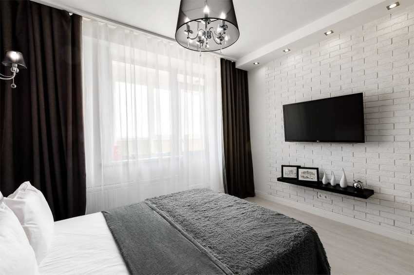 Современная спальня с кирпичной стеной у изголовья и потолочными светильниками