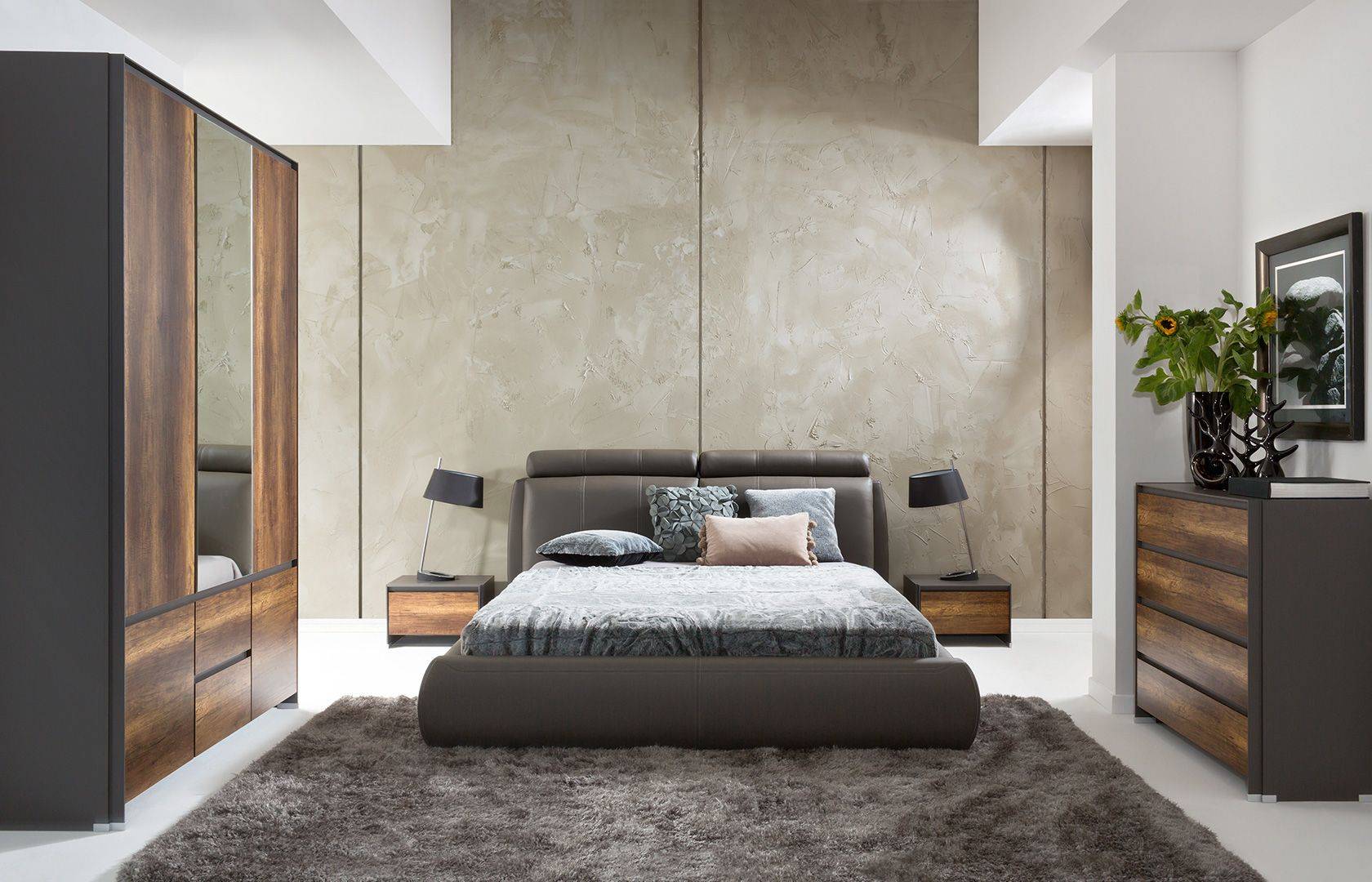 использовать единый цвет для изголовья и тумбы либо противоположные цвета: черный-белый, черный-красный, коричневый-сливочный и т.д.;