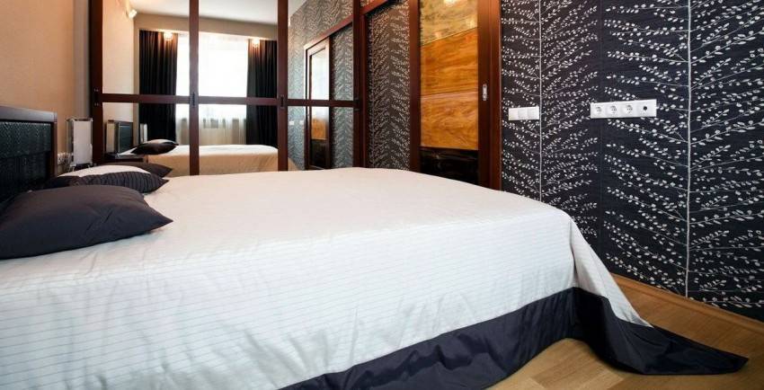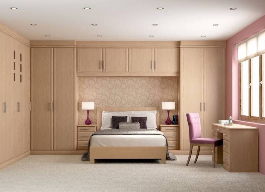 Если планировка позволяет, шкаф в спальне лучше встроить. Для этого необязательно даже сооружать какие-то сложные конструкции — достаточно заказать шкаф, ширина которого равна длине меньшей стены. Если шкаф будет от стены до стены, то и выглядеть он будет как стена, а не как громоздкий придаток.