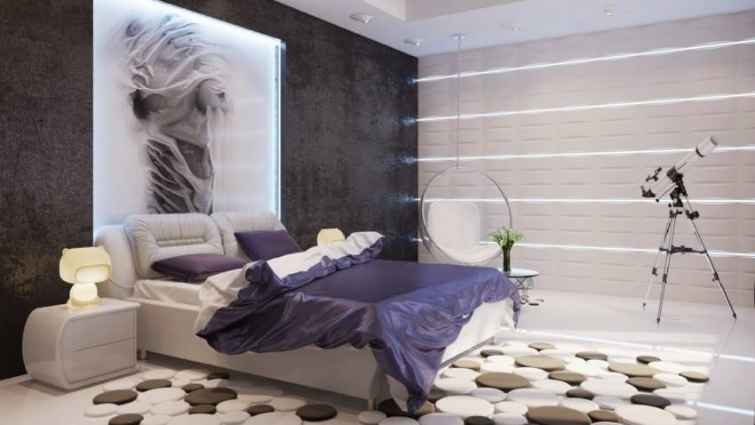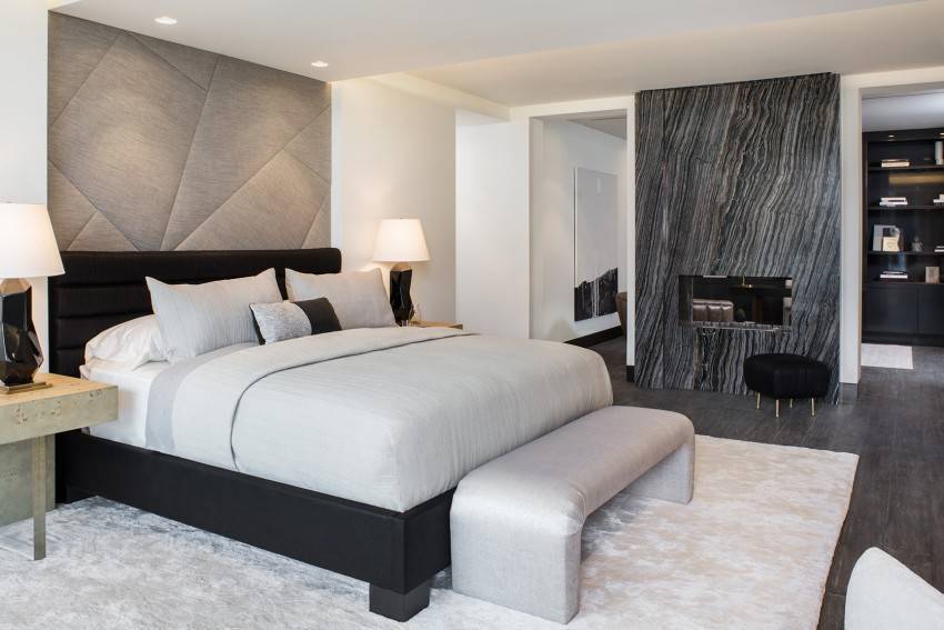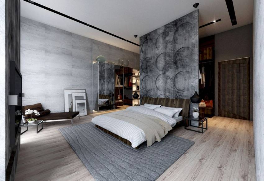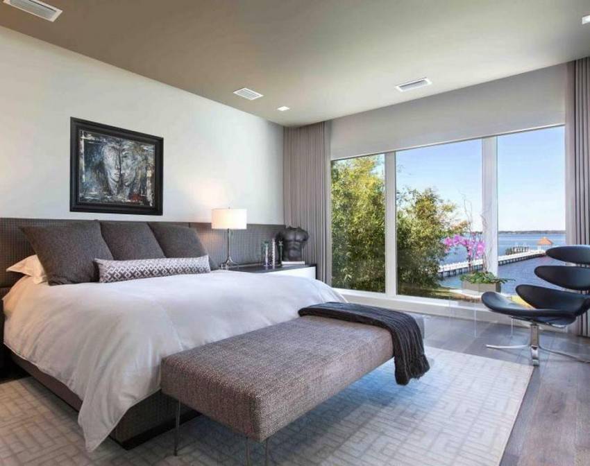 Наличие необходимых вещей для повседневного использования под рукой — это очень высокий уровень комфорта, поэтому спальни в современном стиле стоит оборудовать таким образом, чтобы у кровати всегда находилась тумбочка.