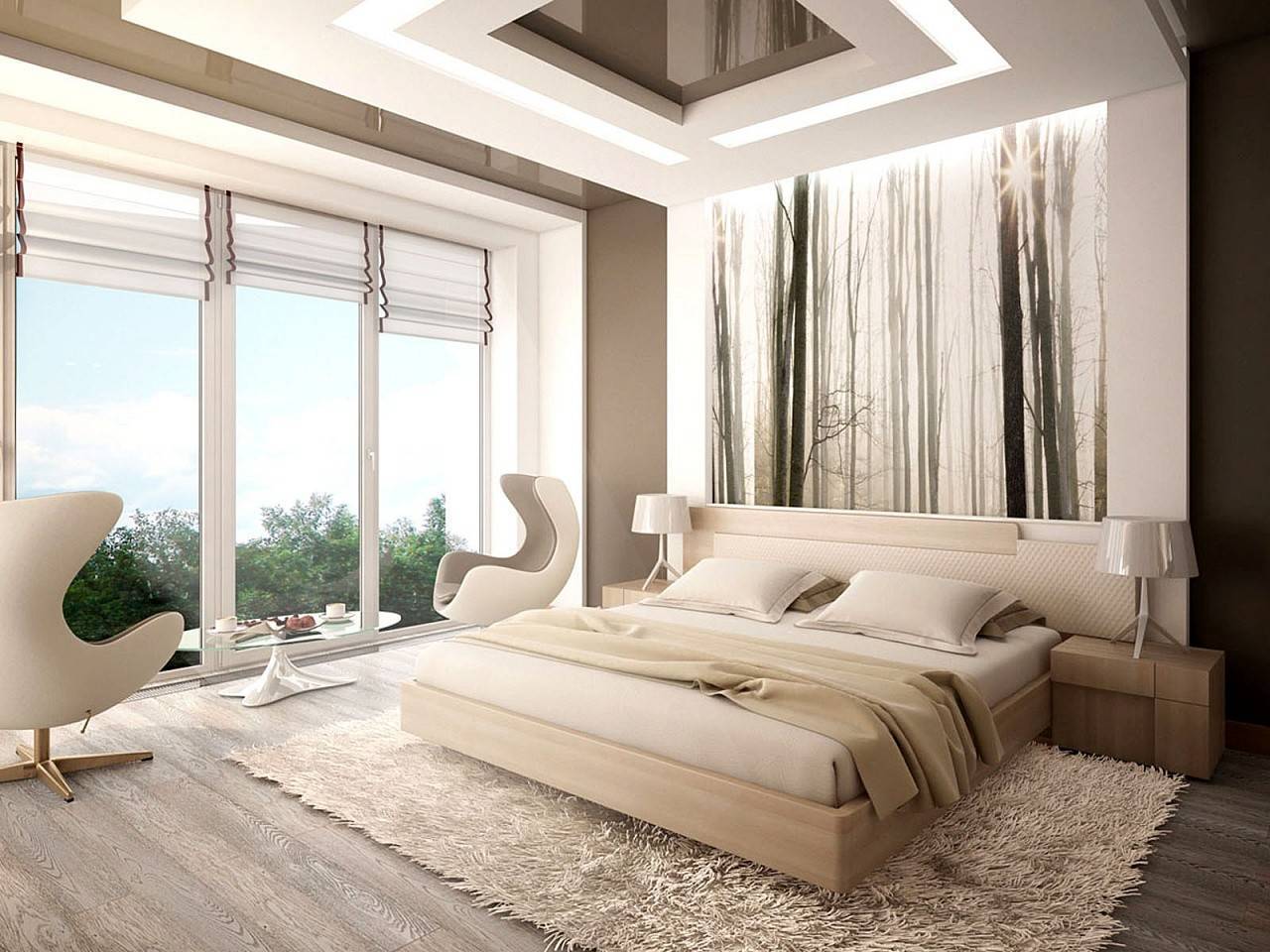 В просторной спальне кровать ставится изголовьем к одной из стен (желательно к той, в которой нет ни дверных, ни оконных проемов), причем так, чтобы кровать была примерно в середине комнаты. Это и красота симметрии, и удобство (одинаковое расстояние до любого другого предмета мебели, окна и выхода).