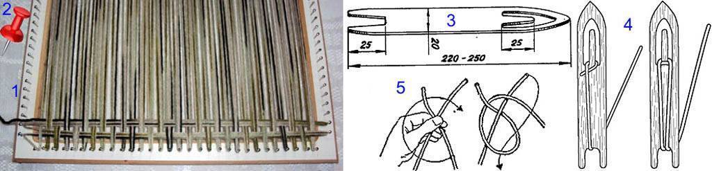 Для тканья ковриков лучше всего подойдет ручной ткацкий челнок старого образца. Его чертеж дан выше на поз. 3. Материал – твердое дерево, фанера, жесткий пластик толщиной 2-4 мм. Как на этот челнок заводится нить, показано на поз. 4. Расходный моток набрасывают на клювик петлями попеременно с одной и с другой стороны. Чтобы снять очередную петлю, челнок подают назад, она сама сойдет с клювика. Делать это нужно, когда челнок вне основы.