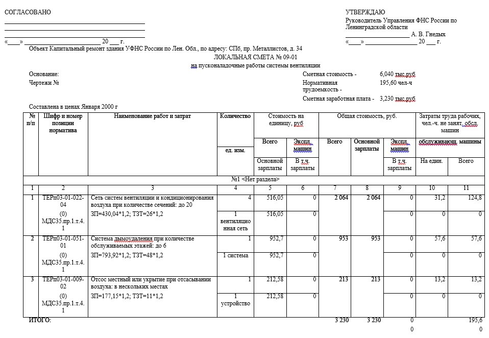 Локальный сметный расчет на работы по монтажу системы кондиционирования и вентиляции, включая: прокладка воздуховодов класса h (нормальные) из оцинкованной стали толщиной 0,5 мм, периметром до 600 мм, установка вентиляционных решеток алюминиевых площадью в свету, установка решетки приточно-вытяжной, установка дроссель-клапанов обратных с ручным приводом периметром до 1000 мм, дросель-клапаны в обечайке с сектором управления из листовой и сортовой стали, установка воздухораспределителей, предназначенных для подачи воздуха в рабочую зону массой до 20 кг (диффузор ДПУ 125), установка зонтов, установка шумоглушителей вентиляционных сечением 300х150 мм, установка камер приточных типовых без секции орошения, приточная установка WRW 70-40/35.40, приточная установка WNR 250/1, приточная установка WNK 315/1, WNK 200/1, установка вентиляторов радиальных массой до 0,05 т, монтаж вытяжных установок (В2, В4, В6-В13), установка камер приточных типовых с секцией орошения производительностью до 10 тыс. м3/час (ЧИЛЛЕРЫ -2шт.), чиллер HWA 142 S/Z/P и 162 S/Z/P, установка блоков присоединительных, кассетный фанкойл DWC 22N, DWC 24N, DWC 31N, DWC 32N, DWC 33N, DWC 34N, прокладка трубопроводов из многослойных металл-полимерных труб, изоляция трубопроводов изделиями из вспененного каучука (АРМОФЛЕКС), вспененного полиэтилена (ТЕРМОФЛЕКС) трубками, трубки из вспененного полиэтилена внутренним диаметром 22 мм, кип и автоматика, блок управления, блок управления CHU 210-W-30/ST, датчик перепада давления, датчик перепада давления 500 РА DPD-5 с контактором, 20-200 РА DPD -2 с контактором, датчик температуры канальный, датчик температуры SNR-1M, установка привода воздушной заслонки К1,05, привод воздушной заслонки GDB 331/1 E/KF, привод воздушной заслонки GSD 321.1А, установка смесительных узлов, смесительный узел SURP60-4.0, SURP 40-1.0, SURP 40-1.6, установка термостатов, термостат AZT – 6, присоединение к приборам электрических проводок под винт: с оконцеванием наконечником и др.