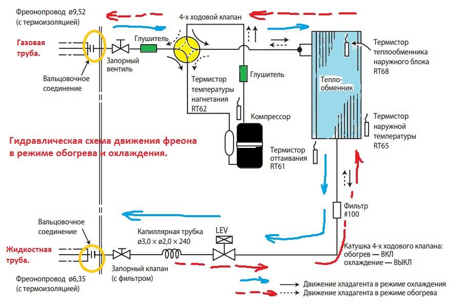 Принцип действия кондиционера в режиме охлаждения – фреон испаряется во внутреннем блоке, а конденсация происходит во внешнем. При работе в режиме обогрева, процесс обратный. Вот как это происходит: под давлением из испарителя по трубкам, в компрессор попадает газообразный фреон, компрессор сжимает его до определённого давления, тем самым нагревая газ до ещё большего состояния. После чего, хладагент обдувается вентилятором, и переходит в жидкое состояние. Воздух всасываемый куллером обдува соответственно нагревается и выходит из блока. Далее жидкий фреон в тёплом состоянии и под давлением попадает на ТРВ (терморегулирующий вентиль) или дроссель, где давление и температура хладагента понижается, а также часть его испаряется. Жидкий и испарённый фреон попадает из дросселя в испаритель, где окончательно испаряется и поглощает оставшееся тепло, а воздух, подаваемый вентилятором с комнаты, охлаждается и подается обратно. Газообразный хладагент, в свою очередь, возвращается обратно во внешний блок. Процесс цикличен.