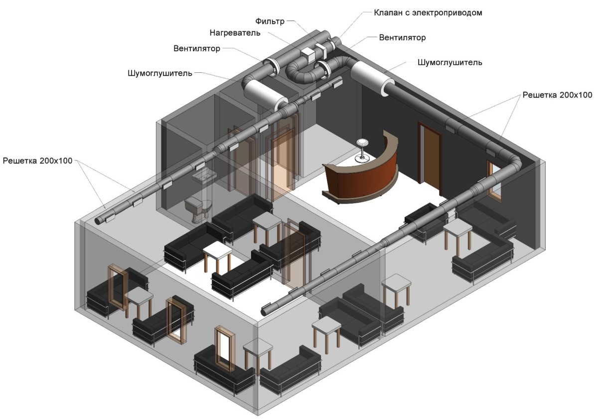 Поэтому специалист должен создать проект вентиляции кальянной, которая будет гарантированно справляться с поставленными задачами и повлечет как можно меньше изменений интерьера. Учитывая вышеизложенные факторы, проектировщик определит тип системы и ее мощность.