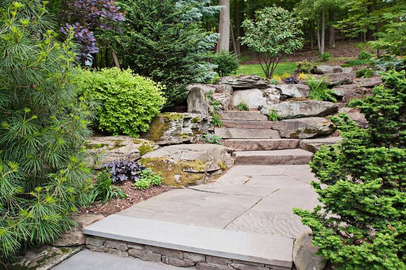 Эти элементы являются обязательными при создании ландшафтного дизайна на участке с уклоном и разработке гармоничного соединения зон и террас. Чтобы все хорошо сочеталось для них лучше использовать тот же материал, что и для террас. Яркость и видимость тропинок можно обеспечить крупными декоративными элементами.