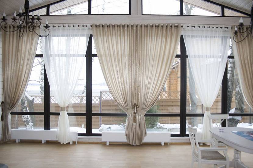 Важно заранее продумать, каким образом оконные проемы будут занавешиваться на ночь. Лучше всего подобрать занавески, гардины, а также тюль по всей длине панорамного остекления
