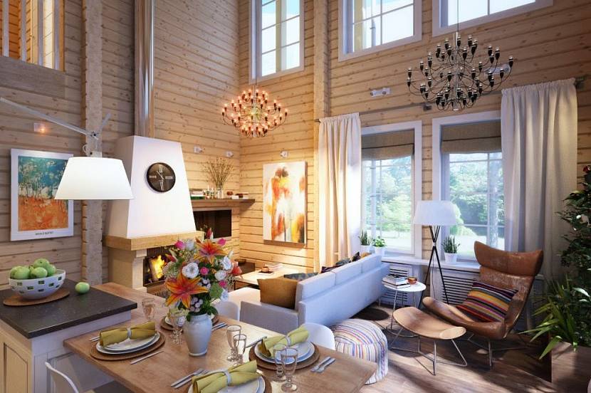 Планировка с высокими потолками визуально расширяет пространство, поэтому у владельцев второго света в деревянном доме возникает ощущение просторной жилплощади даже в случаях, когда общая территория не превышает 150 квадратных метров.