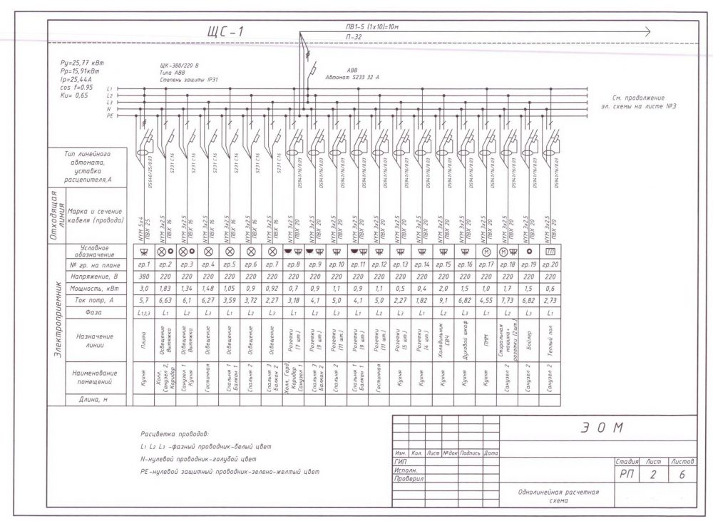 - Указаны максимальные расчетные токи, марка кабелей, сечение токопроводящих жил, длинна линий электропроводки;