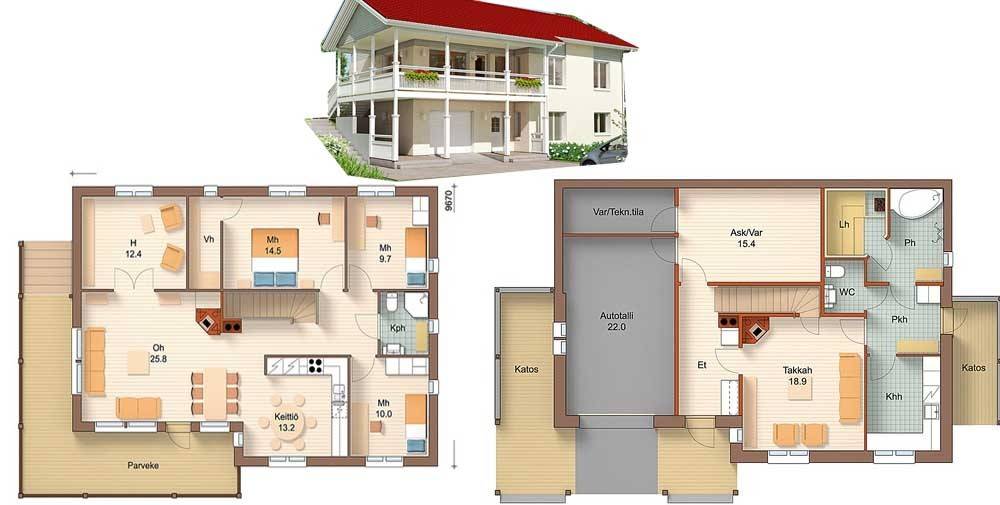 Если размеры участка не такие большие, то хорошим решением будет выстроить на нём двухэтажный дом. При этом вы получите преимущество в использовании таких дополняющих форм архитектуры, как эркер, балкон, терраса и др. Подобным образом можно выполнить конструктивные элементы дома любой конструктивной сложности: начиная от дачного маленького домишки до внушительного по площади коттеджа. Такие помещения, как кухня, гостиная или их совмещённый вариант, а также помещения хозяйственного назначения, санузел и, при желании, гараж в основном располагают на первом этаже. На втором – детские комнаты, спальни, гардеробные, санузел.