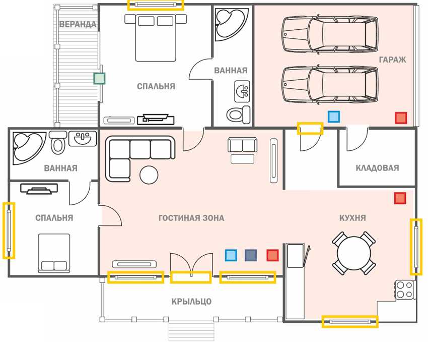 Схема расположения охранных датчиков, где желтым отмечен датчик открытия, красным – движения, зеленым – разбития стекла, голубым – считыватель, синим – сирена, розовым – зона обнаружения движения.