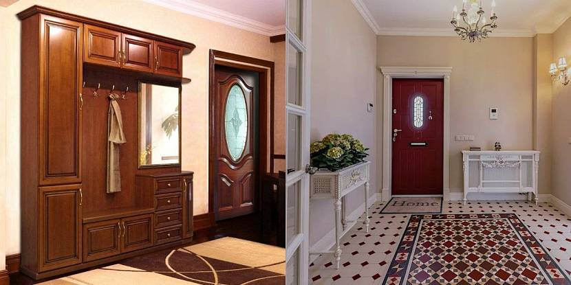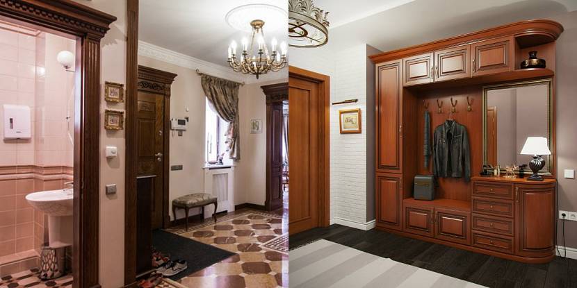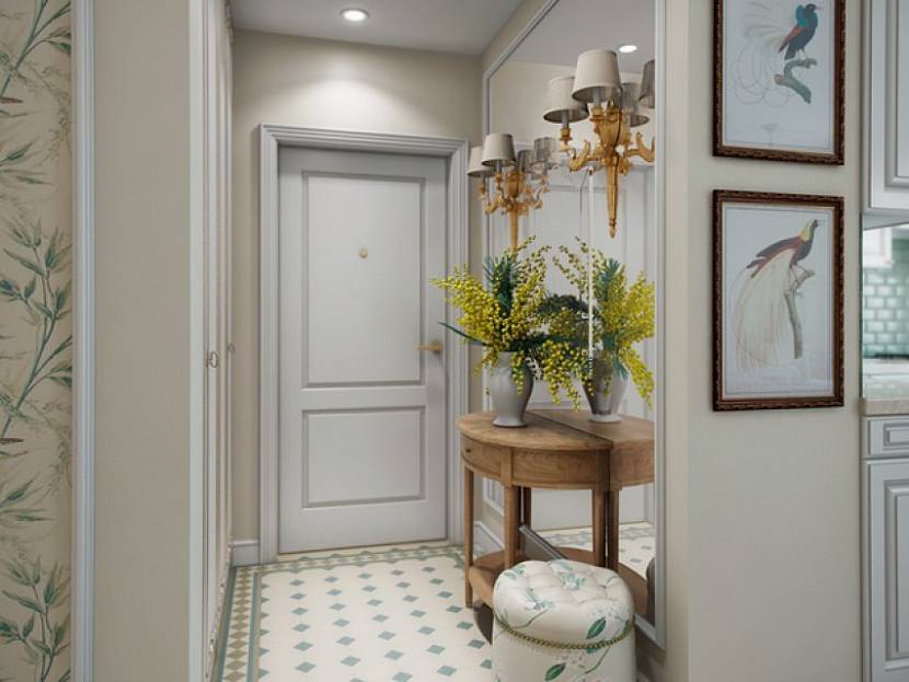 На стенах коридора приветствуется вывешивание семейных или банкетных фотографий в деревянных рамах. В качестве функционального табурета может выступать пышный пуф с вышитым объёмным узором.