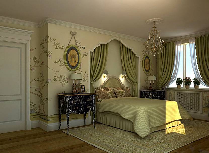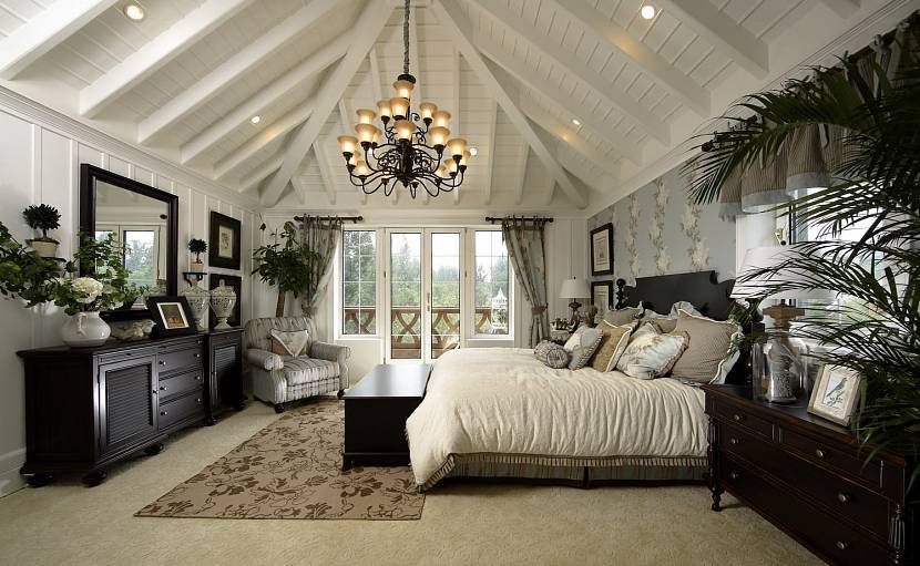 В спальне нельзя обойтись от массивной деревянной кровати с высоким изголовьем. Оно может быть мягким или твердым. В стиле комнаты отдыха допускается незначительный декоративный акцент. Его можно видеть как в самой конструкции кровати, так и других предметах. Для улучшения эстетики на прикроватных тумбочках и столиках (если есть) применяют стеклянные накладки. Английский стиль предполагает отличие оттенка обоев от цвета мебели в спальне.