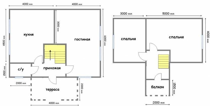 Небольшие двухэтажные дома могут иметь только один санузел на первом этаже, в этом случае все пространство второго этажа занимают спальные комнаты домочадцев.