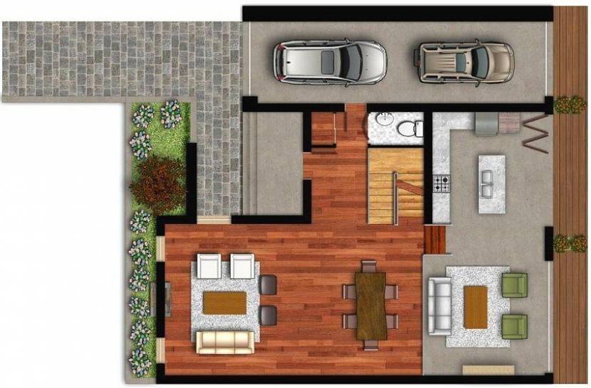 - На первом этаже. Пространство разделено на прихожую, холл перед лестницей, небольшой санузел (ванну заменяет душевая кабина), кухню и просторную гостиную.