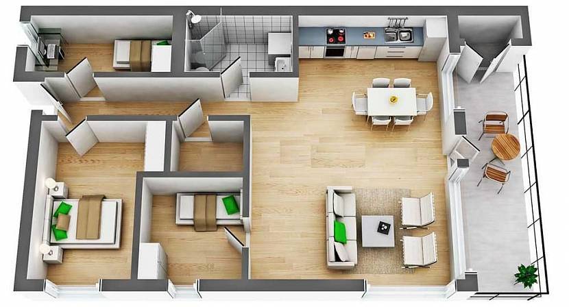 - Верхний этаж. Здесь находятся две или три спальни, ванная. Холл около лестницы может иметь выход на балкон.