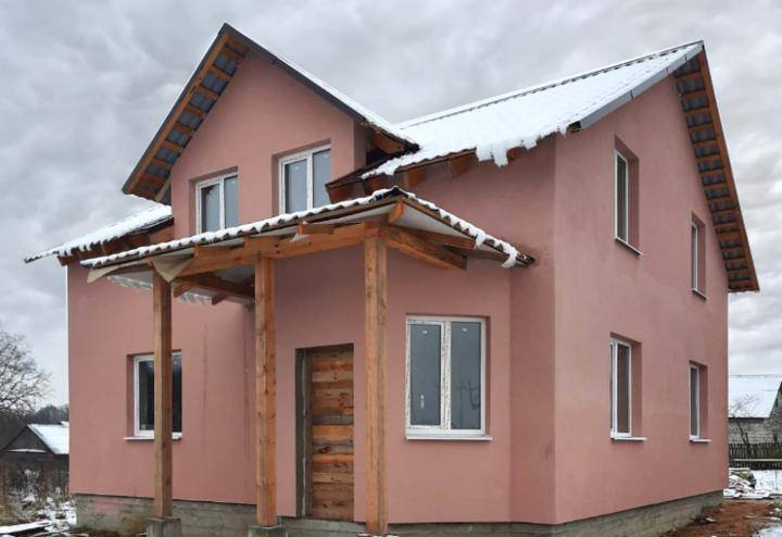 - Декоративная штукатурка. Считается самым популярным материалом для отделки фасадов. Она не только украшает, но и защищает каркас дома от негативных климатических условий.