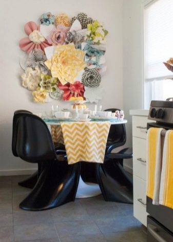 Декорировать стены можно и при помощи различной ткани. Разноцветные обрезки смогут превратиться в полотно в стиле пэчворк, которое сможет не только украсить стену, но и обеспечить некоторый процент шумоизоляции. Тканью можно обтянуть подрамники, в зависимости от текстуры и цвета готовые полотна можно задекорировать различными элементами, например, в винтажном стиле, или оставить без декора, если ткань и так представляет собой целостную интерьерную единицу.