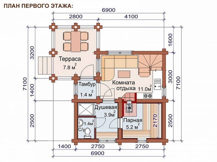 Минимальный состав помещений следующий: парилка, моечная, комната отдыха и предбанник