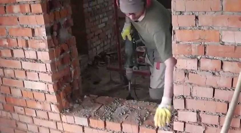 - Разбирается стена молотком и перфоратором. В этом случае просверливаются в нескольких местах стены отверстия, ослабляющие кирпичную кладку.