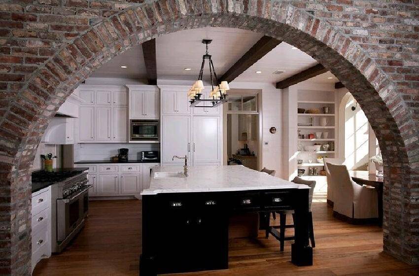 - Арочный проем. Более сложный вариант, так как при этом нужно учитывать форму изгибов. Для кирпичных стен выполнить такую работу может только профессионал, так как требуется соотношение с расположением швов кладки.