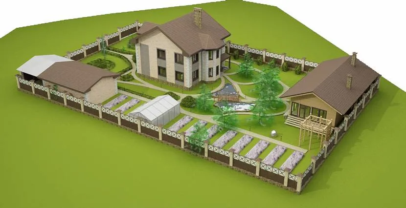 Кроме того, важно уже на этом этапе определиться с расположением других построек и зон на участке, чтобы любым из них было удобно пользоваться. План участка в 3D-изображении Источник mtdata.ru
