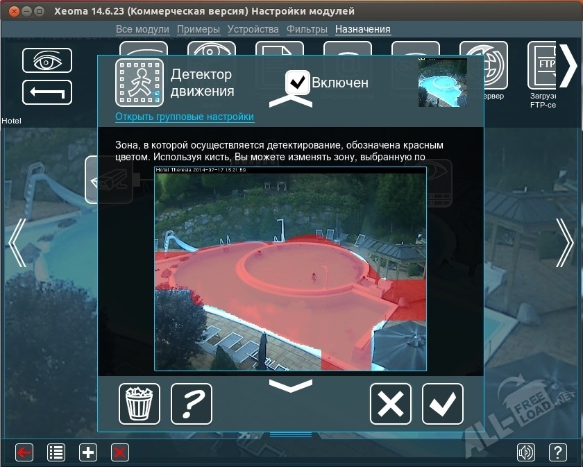 Уникальная особенность этой программы — поддержка датчиков движения и возможность их настройки. Если они срабатывают, вы сможете получать сигналы, отправлять их на сигнализацию и т.д.