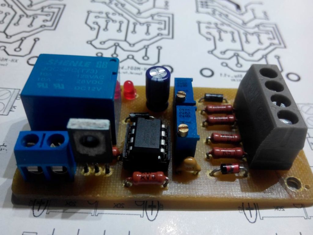 Схема монтируется на плате, резистор располагается на ее поверхности либо выводится проводами. В плате есть места для винтовых клеммников. После впаивания комплектующих, излишки пайки удаляют и проверяют контакты. Для защиты транзистора параллельно реле монтируется диод. В устройстве устанавливается время срабатывания. Если к выходу подключить реле, можно корректировать нагрузку.