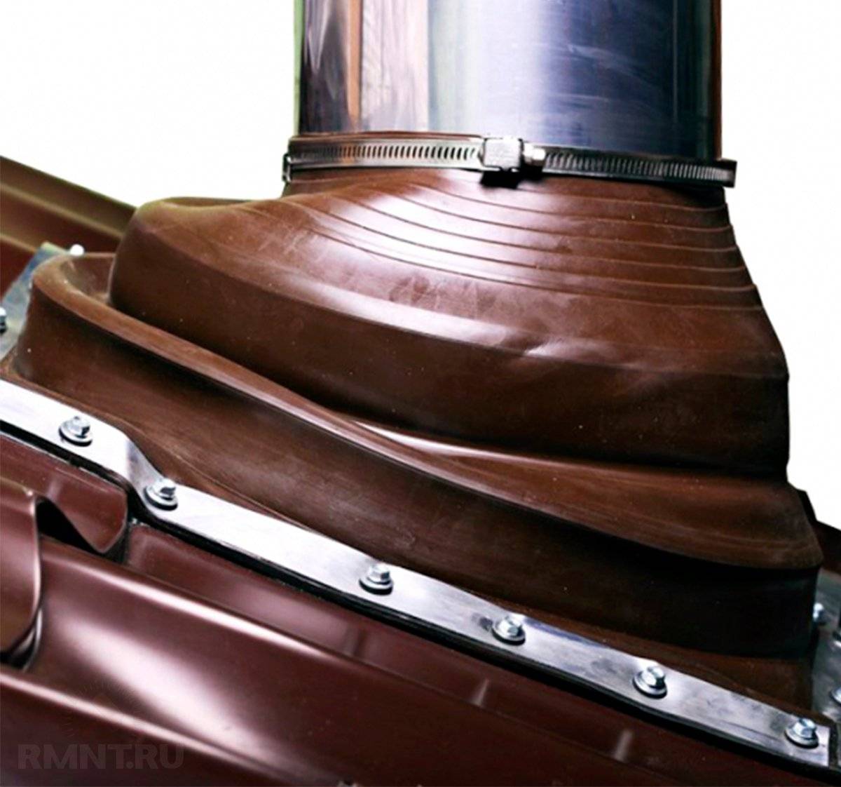 3. Для герметизации круглых труб в комплект материала часто бывает включен металлический круглый фланец с резиновой/силиконовой гофрой. Если нет, можно приобрести отдельно. Фланец надевают на трубу, промазывают герметиком и фиксируют саморезами к обрешетке.