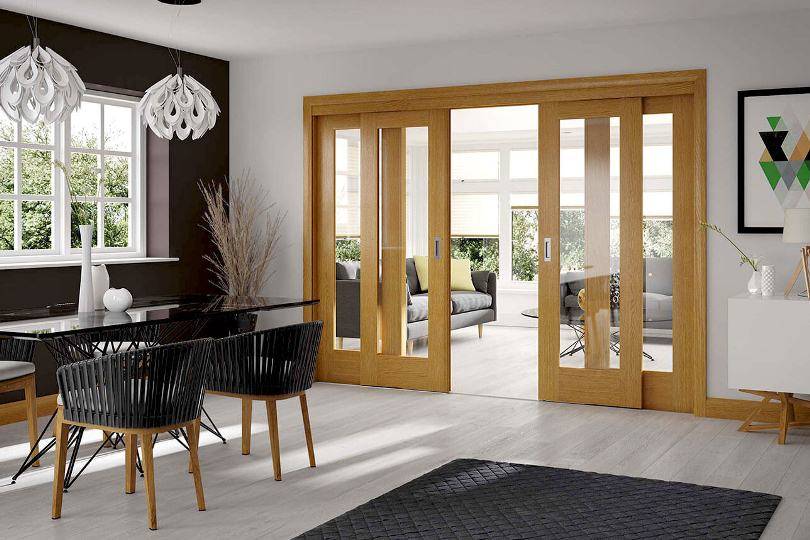 Раздвижные двери сильно экономят пространство, позволяя ставить предметы мебели вне зависимости от расположения двери. Двери открываются за счет плавно двигающихся роликов дверных створок по направляющим, вправо или влево. То есть открывание дверей построено по принципу купе. Двойные двери также могут быть с стеклянными или зеркальными вставками, что лишь дополнит интерьер.