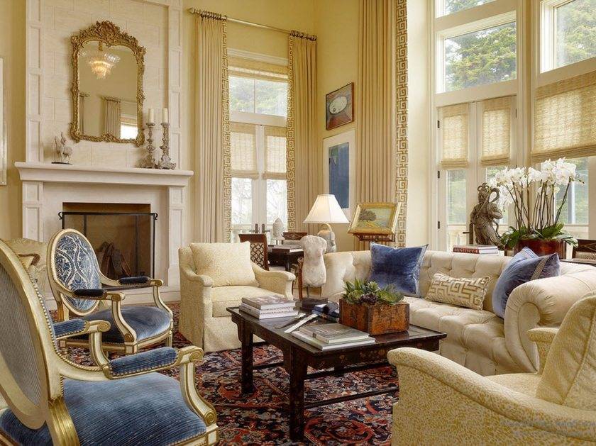 Удобство, комфорт и прочность – характерные черты интерьера. Здесь вы не найдете замысловатых форм и нефункциональной мебели, бесполезных аксессуаров. В помещении господствуют гармоничное сочетание мебели и сбалансированность пропорций. Стеновая отделка представлена светлыми обоями (все оттенки желтого и бежевого, персиковый, розовый, голубой). Допускается простой рисунок. В дизайне преобладают коричневые оттенки и бордо. Полы также не отличаются вычурностью – зачастую это деревянная основа, скрывающаяся за однотонным ковром.