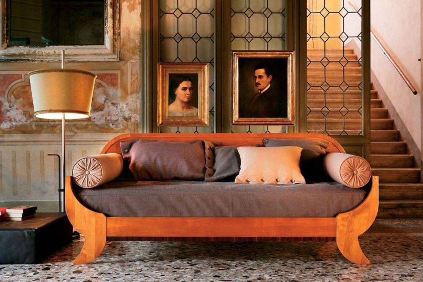 Формы типичного для эпохи бидермайера дивана напоминают ампирные, только они предельно упрощены, и лишены излишней роскоши. Подлокотники и ножки кресел изогнутые, как и у большинства предметов мебели.