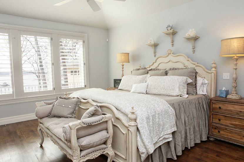 Остальная палитра. Она состоит из приглушенных и пастельных оттенков, ненавязчиво подчеркивающих детали интерьера и декора. Кроме белого, часто используется серые, тепло-коричневые и бежевые оттенки, бледные тона желтого, зеленого, карамельного, песочного. В версии прованса палитра дополняется нежно-розовым, лавандовым, мятным, сиреневым, голубым цветом. Такой подбор цветовой гаммы считается типично французской; серый в интерьере используется дозировано, в виде легких жемчужных оттенков.