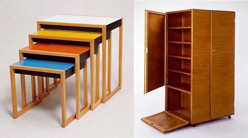 Громоздкие предметы мебели. Важные критерии выбора — простая форма, качество, минимум декора. Ценится компактность, помогающая грамотно организовать пространство. Поэтому решением в лучших традициях баухауза будет встраиваемый шкаф, причем не только платяной, но и открытый. Популярный нынче шкаф-купе — детище школы дизайна баухауз.
