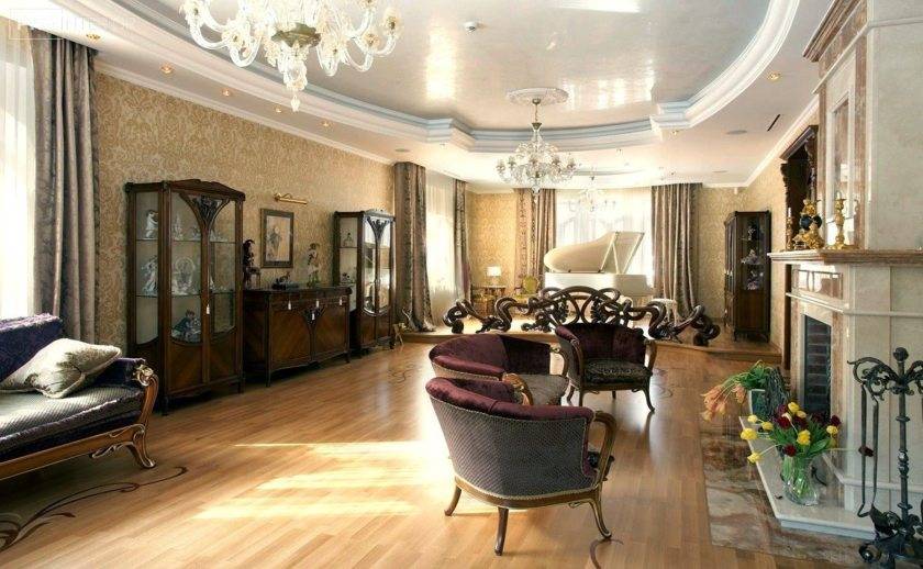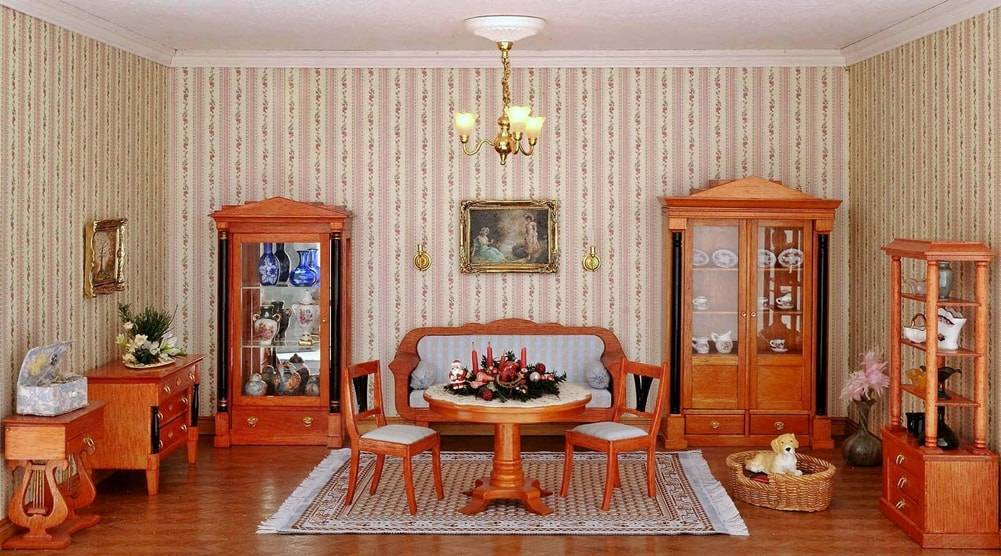 Центральный элемент комнаты – большой стол. По стенам располагают шкафы для посуды или серванты, комоды, бюро. Дополняют обстановку этажерки, витрины, трюмо, угловые шкафчики.