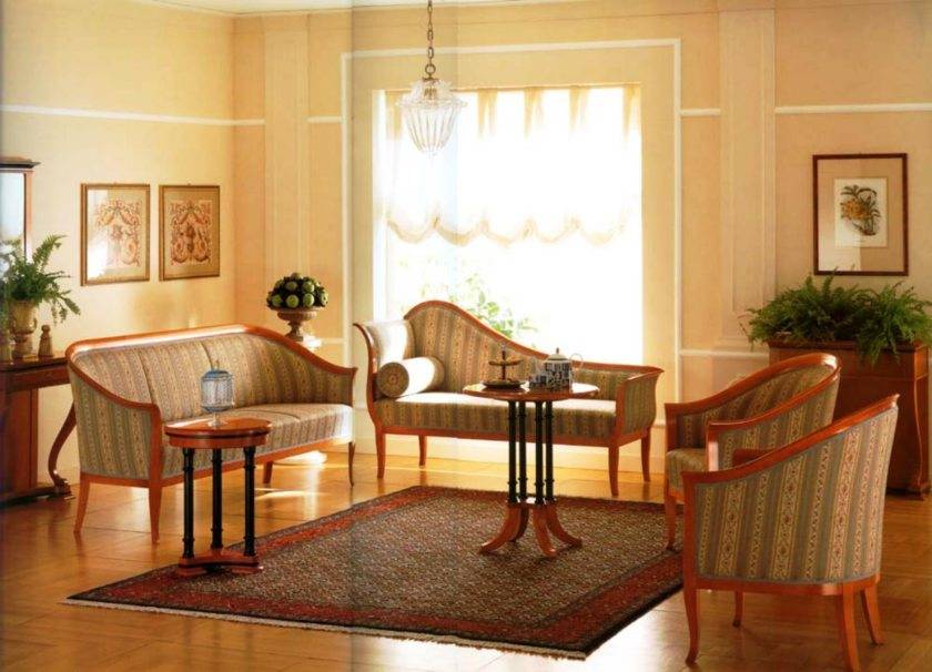 - Мебель выполнена из светлых пород дерева. Обивка украшена простенькими узорами (полосы, цветы). Мебельная группа размещена в центре помещения. Особенности комнаты (ниши, пустоты) подчеркиваются разнообразным декором.