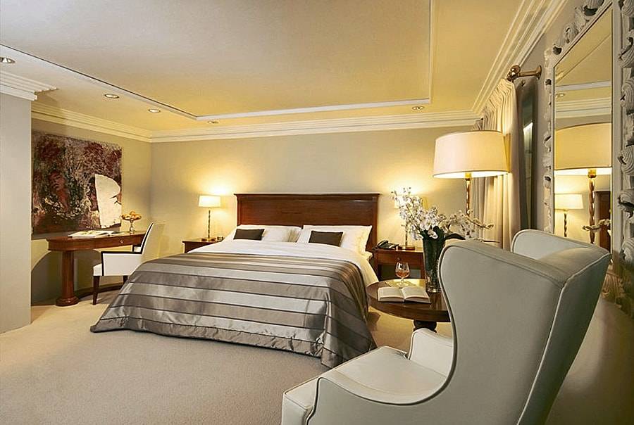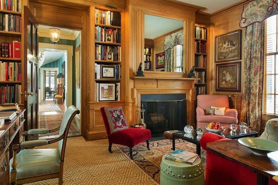 Удобство, комфорт и прочность – характерные черты интерьера. Здесь вы не найдете замысловатых форм и нефункциональной мебели, бесполезных аксессуаров. В помещении господствуют гармоничное сочетание мебели и сбалансированность пропорций. Стеновая отделка представлена светлыми обоями (все оттенки желтого и бежевого, персиковый, розовый, голубой). Допускается простой рисунок. В дизайне преобладают коричневые оттенки и бордо. Полы также не отличаются вычурностью – зачастую это деревянная основа, скрывающаяся за однотонным ковром.
