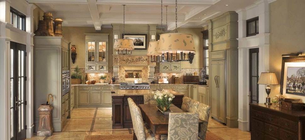 Общая простота еще не означает, что обстановка будет минималистичной, хотя, это и не будет идти в разрез с основной идеей. Декор представлен своеобразно: вшивками, гобеленами или гравюрами на стенах, а также различными семейными фотографиями. Текстильных элементов также много – салфетки, покрывала, подушки или пледы будут очень кстати. За стеклянными дверцами шкафчиков расставляют фарфоровую посуду, различные сувениры или керамические статуэтки.