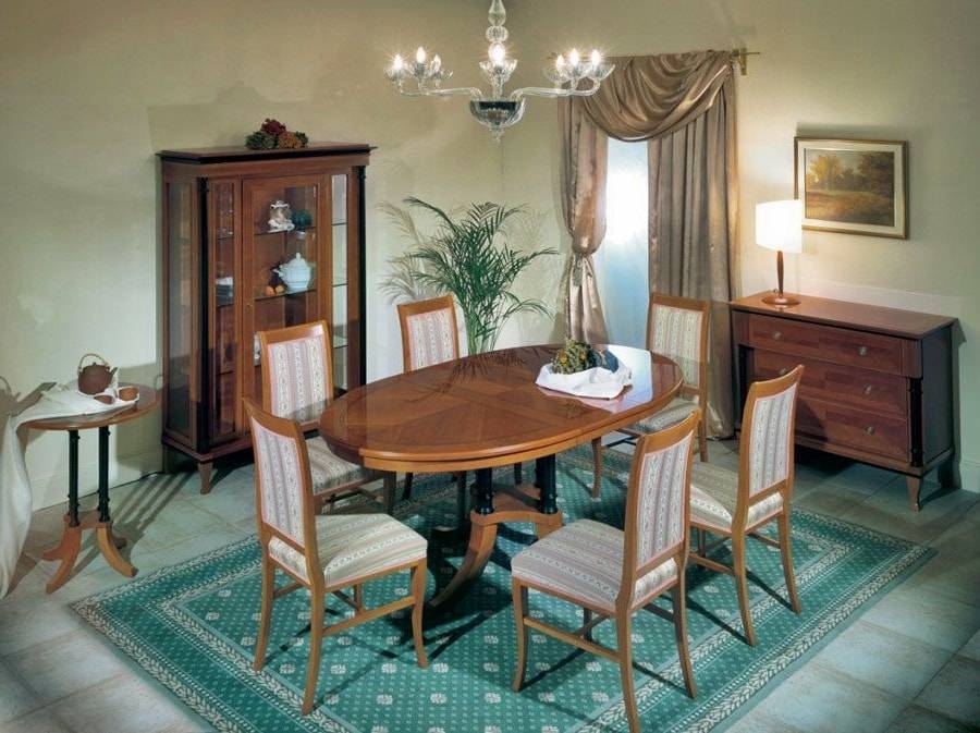 Центральный элемент комнаты – большой стол. По стенам располагают шкафы для посуды или серванты, комоды, бюро. Дополняют обстановку этажерки, витрины, трюмо, угловые шкафчики.