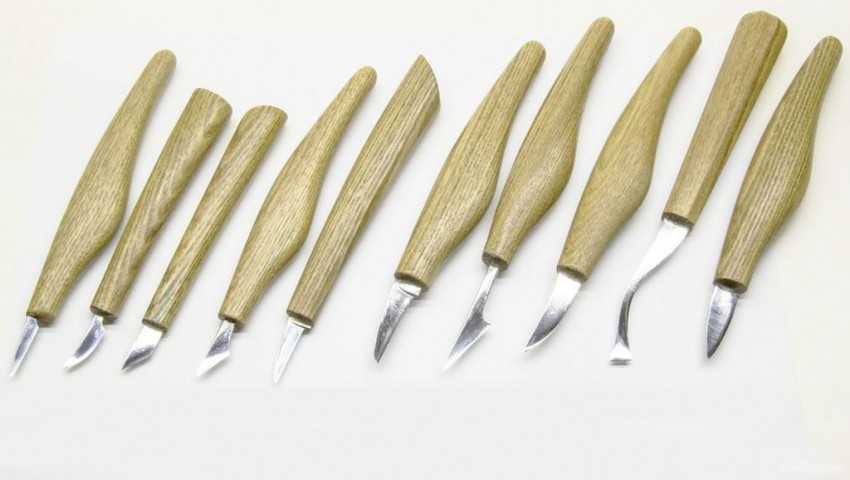 Чтобы выполнить геометрическую резьбу на поверхности однородной древесины, можно взять несколько мелких стамесок и один резак с рабочей частью шириной 2 мм.