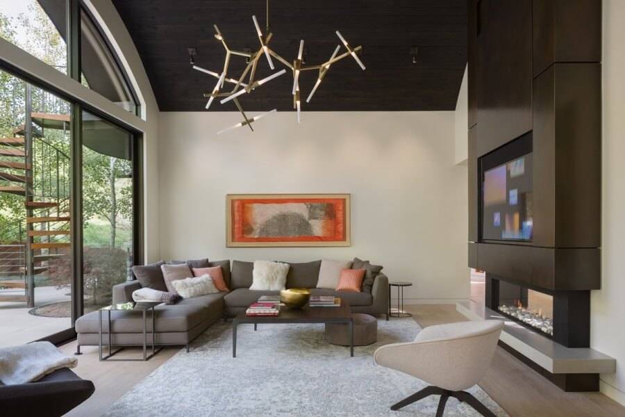 Гостиная. Элементы витража могут быть выполнены в любом цвете; они идеально вписываются в стиль арт-деко, барокко, модерн, классический. Популярные техники — Тиффани, заливка, фацет, фьюзинг, пленочная.