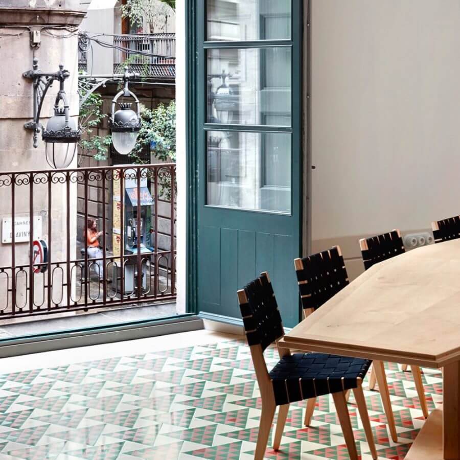 В гостиной комнате высокие окна лишь немного украшены витражами