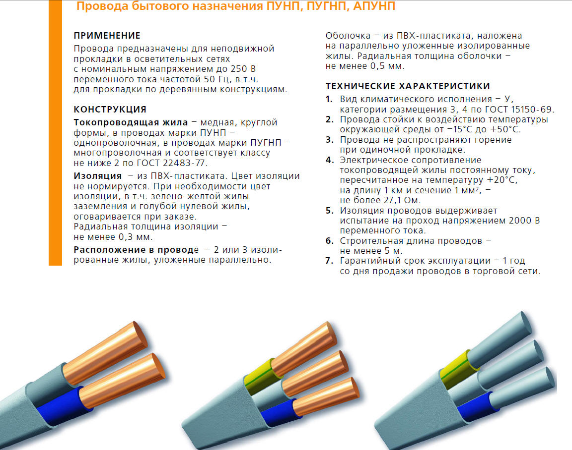 Расшифровка аббревиатуры ПУНП выглядит следующим образом: П – провод, УН – универсальный, П – плоский.