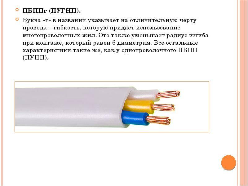 отсутствие буквы «А» в начале – медная жила; «Пу» — провод установочный; «Г» — для условий монтажа, требующих повышенной гибкости; «В» — изоляция из ПВХ-пластиката, в том числе пониженной пожарной опасности и термостойкие;