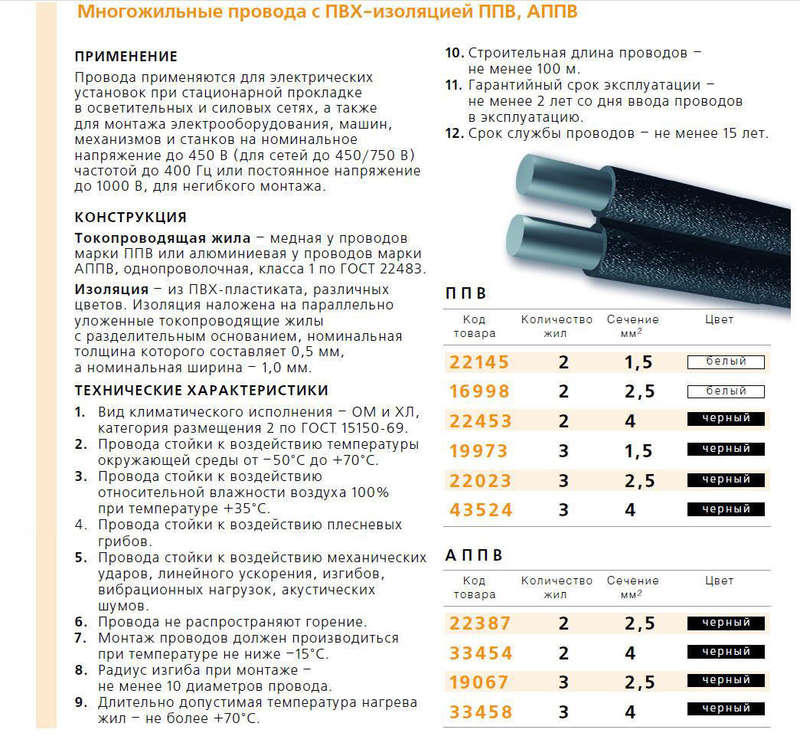 | ПВ1 (без оболочки, сечение 0,5-95,0 мм2 | ПуВ (без оболочки, сечение 0,5-400, мм2) | ППВ (плоский, без оболочки) | ПуВВ (плоский, в оболочке) |