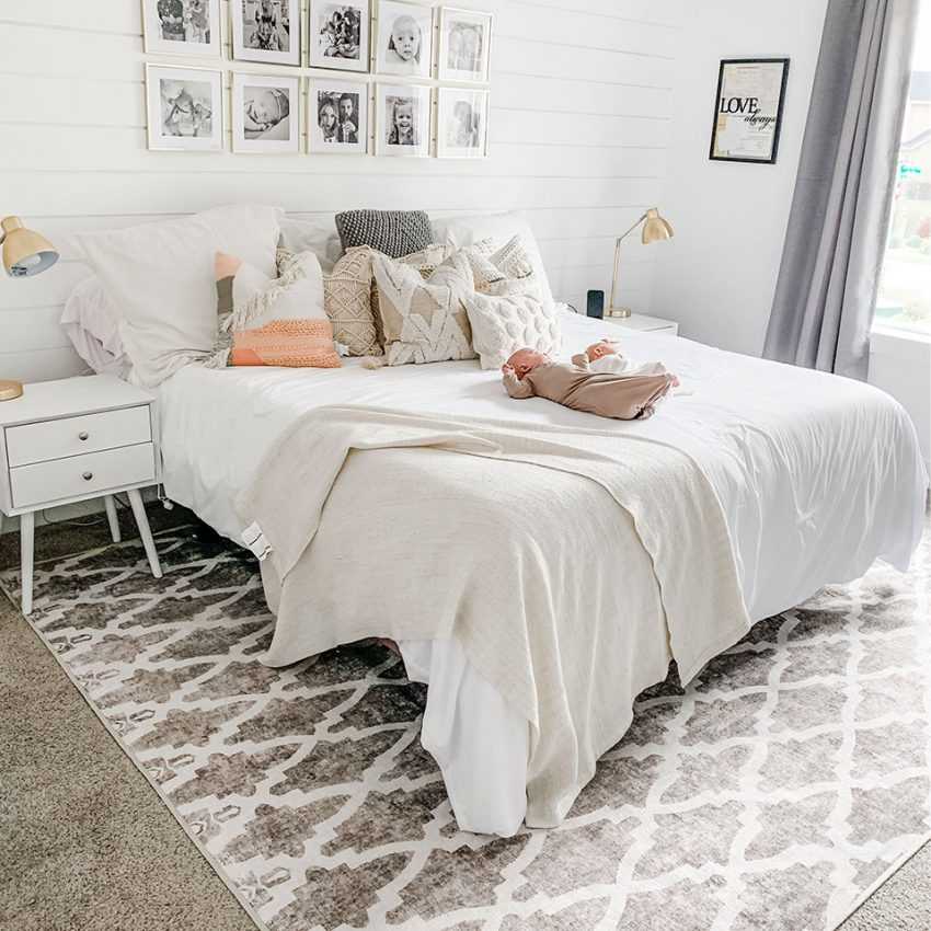 - Отказаться от яркого ковра. Он не только будет привлекать к себе слишком много внимания, но и сделает комнату визуально меньше. Его лучше переложить в гостиную.